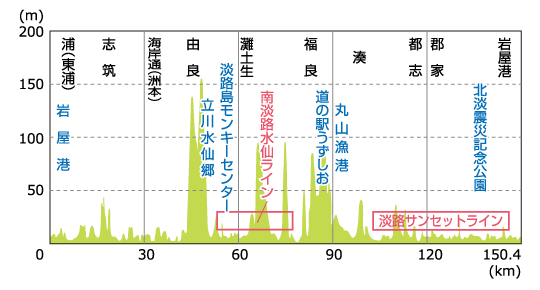 淡路島を走るサイクリストの目標コース!岩屋から洲本までは交通量と信号が多い国道を通りますが、由良からはアワイチの難所と呼ばれる山岳路が続きます。福良から湊にかけても海岸線のアップダウンが続き、最後の50kmは疲労との闘い。延々と続く平坦な海岸線を北上します。一泊二日での完走や、スタート地点を変えて走るのもおススメです。
