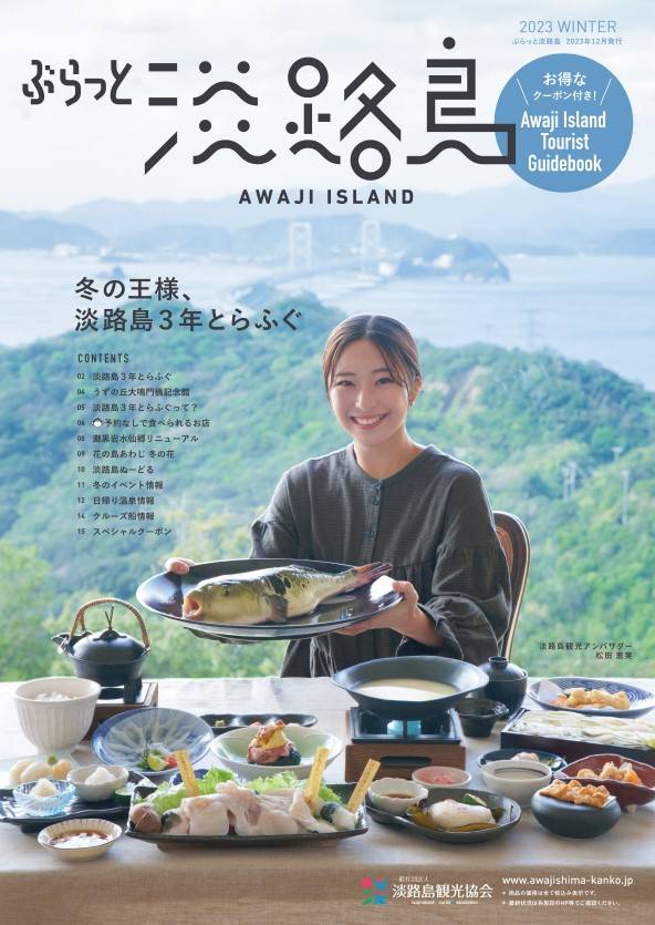 今号は「冬の王様、淡路島3年とらふぐ」をテーマに予約なしで淡路島3年とらふぐを食べられるお店を特集しています。お得なクーポンページもあります。