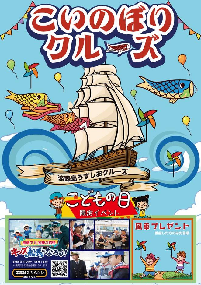 南あわじ市・福良から出港している「うずしおクルーズ」では、2024年4月20日(土)~5月31日(金)まで「こいのぼりクルーズ」を初開催いたします。子どもたちの健やかな成長を願って、元気な鯉のぼりを揚げるのは、この時期ならではの家族の楽しいイベントです。うずしおクルーズ遊覧船に掲揚された鯉のぼりが、地域住民をはじめ観光客の方々もその景観を楽しんでいただき、季節の風物詩として地域の名物になるよう願っています。また、年間を通じて最大級の渦が発生する「春の大潮」シーズンを迎えております。この機会に日本で見られる世界一の自然現象である渦潮を、淡路島うずしおクルーズで体験してください。